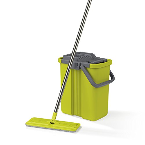 Wischmopp-System inklusive Eimer mit Auswring-Mechanismus | Eimer mit 2-Kammer-System zum Trocknen und Befeuchten | Auswringen & Reinigen ohne Bücken und krummen Rücken | Ideal für Laminat, Parkett, Fliesen und nahezu alle Böden im Haushalt